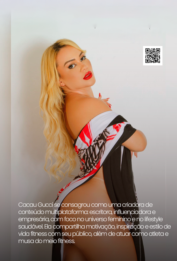Cacau Gucci se consagrou como uma criadora de conteúdo multiplataforma: escritora, influenciadora e empresária, com foco no universo feminino e no lifestyle saudável. Ela compartilha motivação, inspiração e estilo de vida fitness com seu público, além de atuar como atleta e musa do meio fitness.
