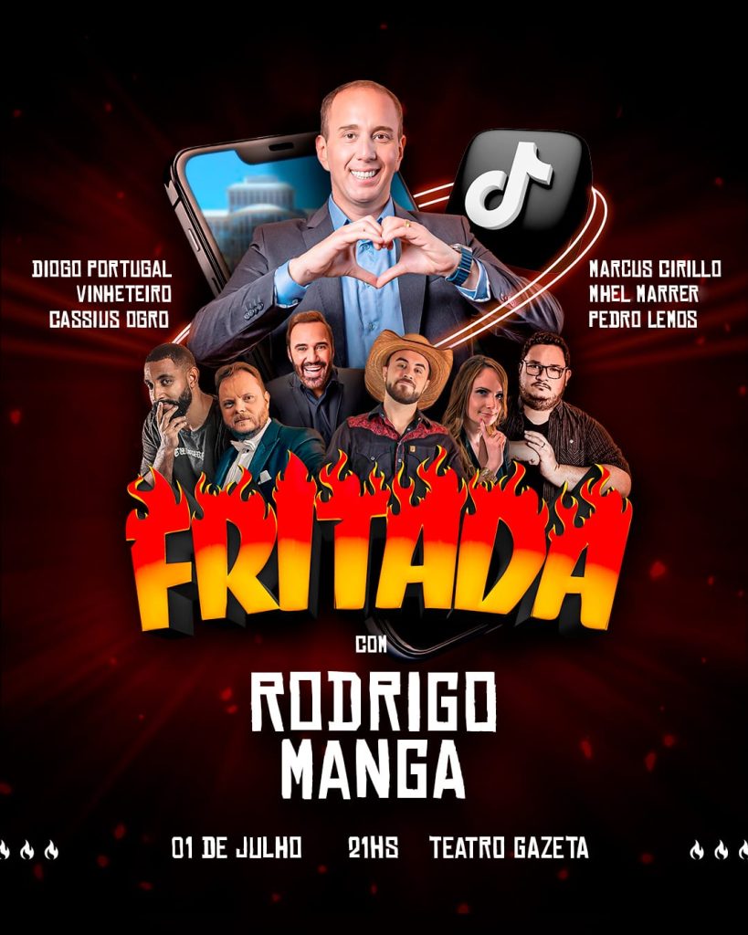 O comediante Diogo Portugal, um dos pioneiros do stand-up comedy no Brasil, apresenta o show “Fritada” no Teatro Gazeta, em São Paulo, na próxima terça-feira, 1º de julho, às 21h. Neste episódio, ele comanda uma verdadeira sessão de humor afiado ao lado dos comediantes Vinheteiro, Cassius Ogro, Marcus Cirillo, Mhel Marrer e Pedro Lemos. O Convidado de honra da vez é o prefeito de Sorocaba, Rodrigo Manga, que viralizou nas redes sociais com seus vídeos bem-humorados.