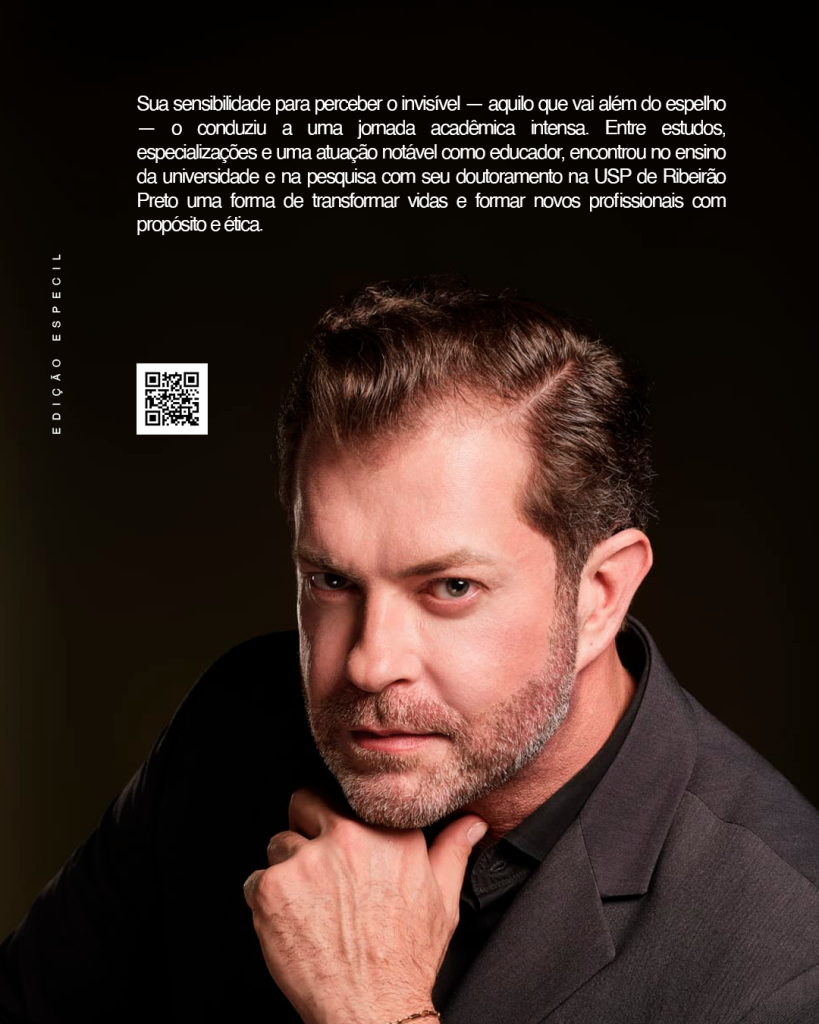 Sua sensibilidade para perceber o invisível — aquilo que vai além do espelho — o conduziu a uma jornada acadêmica intensa. Entre estudos, especializações e uma atuação notável como educador, encontrou no ensino da universidade e na pesquisa com seu doutoramento na USP de Ribeirão Preto uma forma de transformar vidas e formar novos profissionais com propósito e ética.