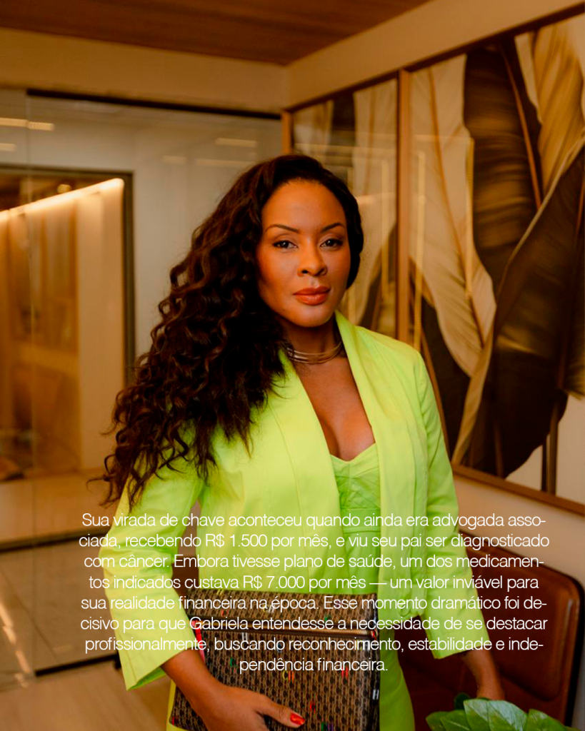 Sua virada de chave aconteceu quando ainda era advogada associada, recebendo R$ 1.500 por mês, e viu seu pai ser diagnosticado com câncer. Embora tivesse plano de saúde, um dos medicamentos indicados custava R$ 7.000 por mês — um valor inviável para sua realidade financeira na época. Esse momento dramático foi decisivo para que Gabriela entendesse a necessidade de se destacar profissionalmente, buscando reconhecimento, estabilidade e independência financeira.