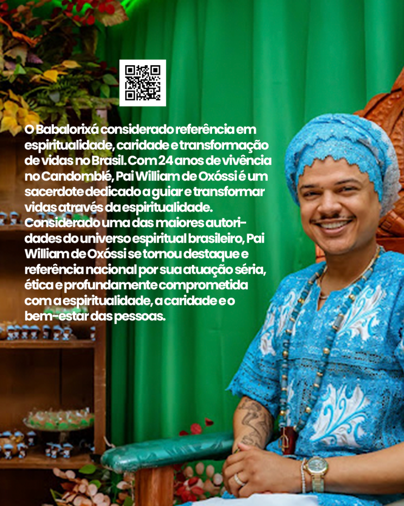 O Babalorixá considerado referência em espiritualidade, caridade e transformação de vidas no Brasil. Com 24 anos de vivência no Candomblé, Pai William de Oxóssi é um sacerdote dedicado a guiar e transformar vidas através da espiritualidade.