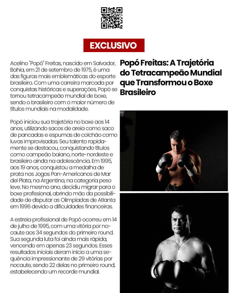 Acelino “Popó” Freitas, nascido em Salvador, Bahia, em 21 de setembro de 1975, é uma das figuras mais emblemáticas do esporte brasileiro. Com uma carreira marcada por conquistas históricas e superações, Popó se tornou tetracampeão mundial de boxe, sendo o brasileiro com o maior número de títulos mundiais na modalidade.
