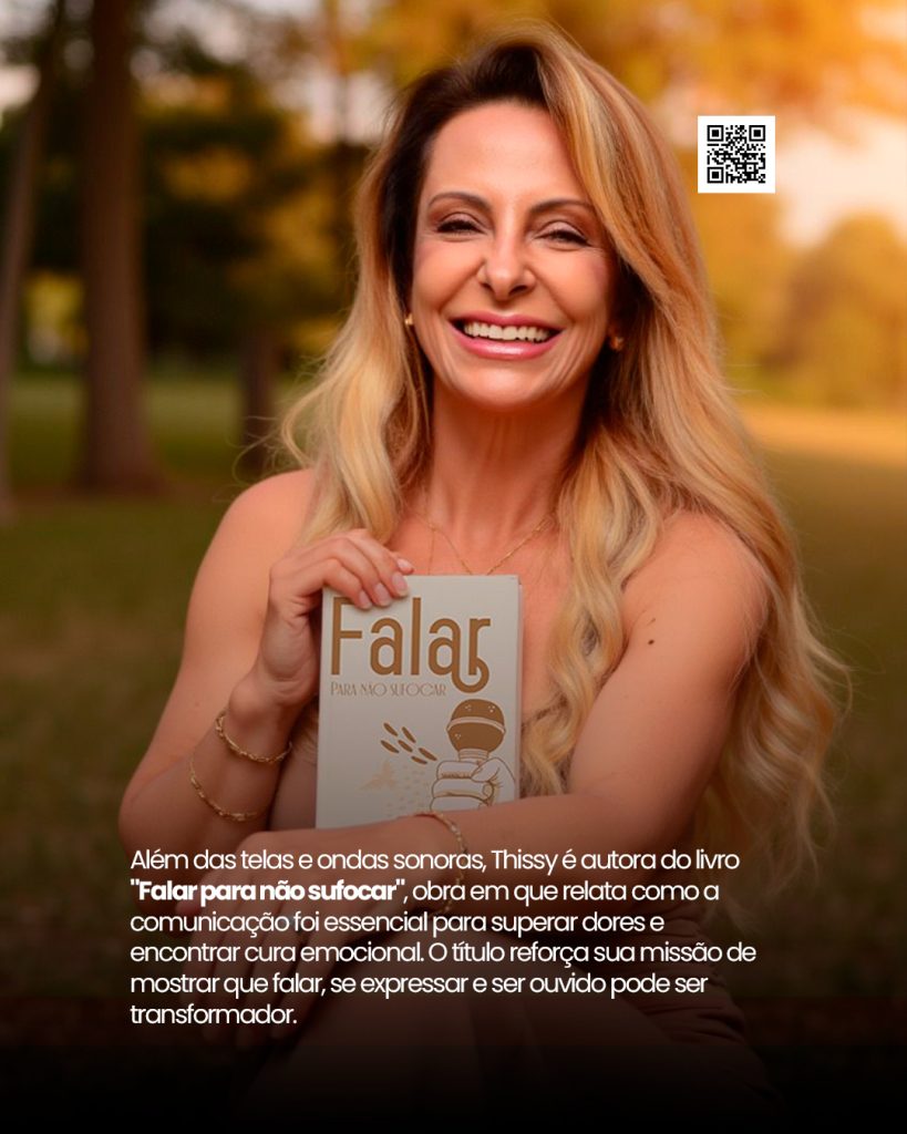 Além das telas e ondas sonoras, Thissy é autora do livro “Falar para não sufocar”, obra em que relata como a comunicação foi essencial para superar dores e encontrar cura emocional. O título reforça sua missão de mostrar que falar, se expressar e ser ouvido pode ser transformador.
